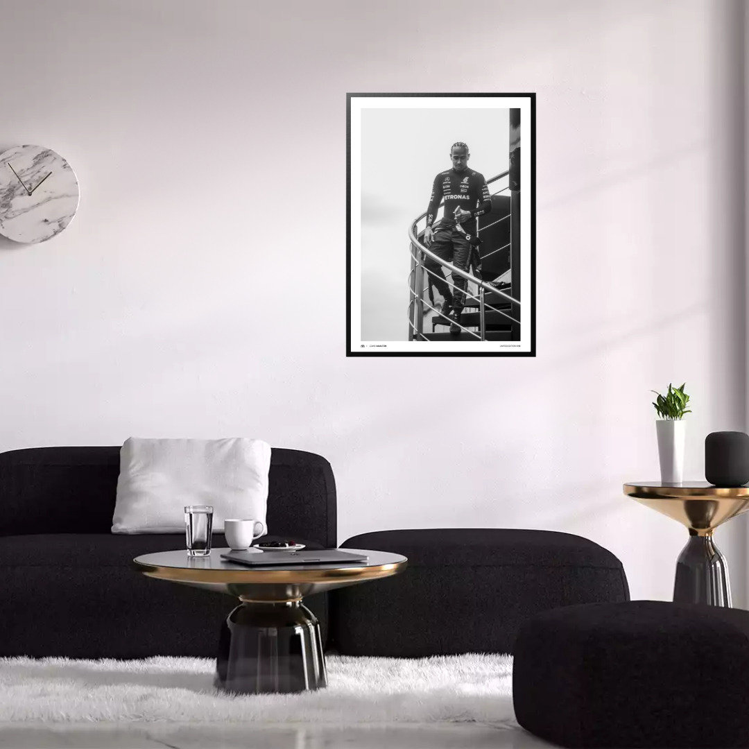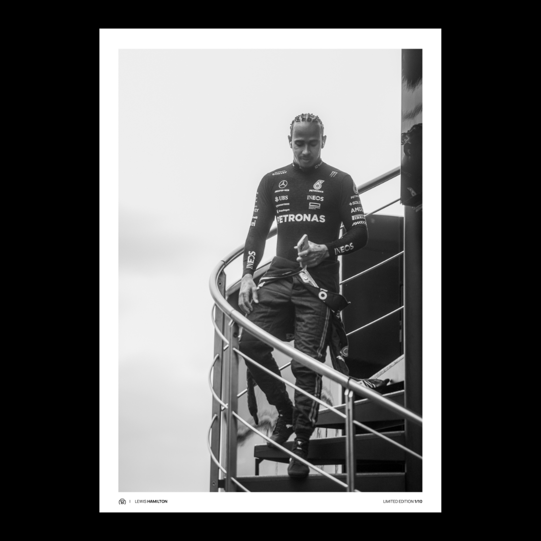 Lewis Hamilton descend de son motorhome, accueilli par la clameur du public britannique. Calme, concentré, conscient que chaque regard est braqué sur lui. Capturée en noir et blanc, cette image fige la prestance d’un septuple champion du monde sur son terrain de gloire.